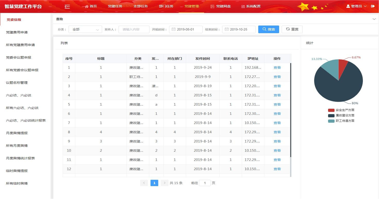党务管理实现对日常党务工作的管理,功能包括党委信箱、党组织活动经费使用申请、党委会议题申报、“六必谈六必访”记录、舆情管理等,实现党务在线办、协同办,减少党务人员的工作流程,提升工作效率。